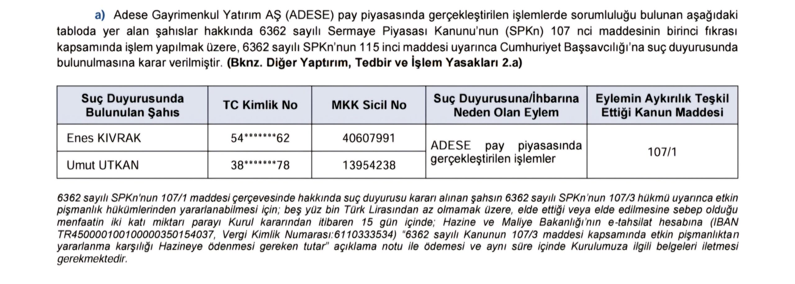 Buna göre; SPK tarafından yapılan incelemeler sonucunda, aşağıdaki tabloda yer alan kişi ve kurumlar hakkında suç duyurusu yapılmasına karar verildi.