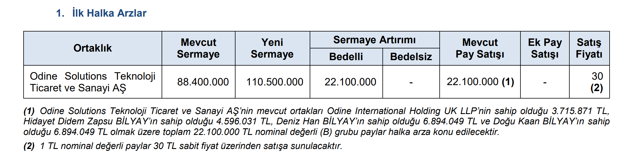 Odine Solutions Teknoloji Ticaret ve Sanayi AŞ‘nin 1 TL nominal bedelli payları 30 TL sabit bedelle halka arz edilecek. Odine Solutions Teknoloji Ticaret ve Sanayi AŞ‘nin halka arz büyüklüğü 1,326 milyar TL olarak gerçekleşecek.