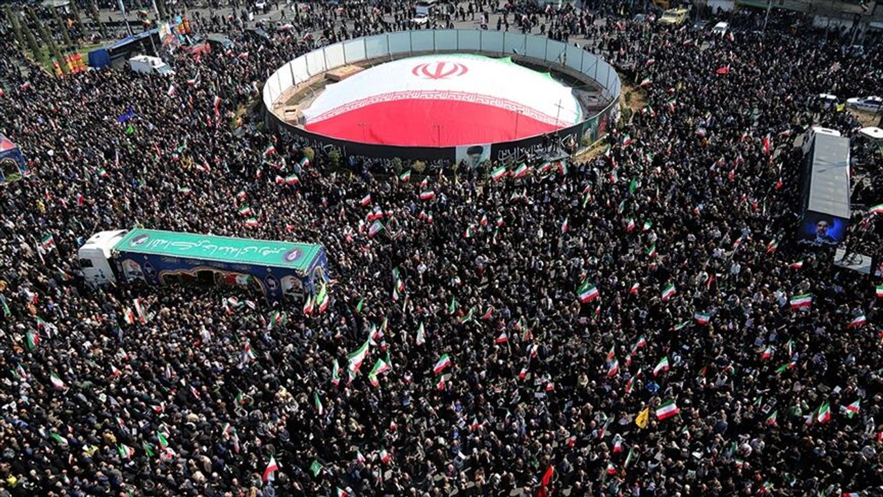 Tahran'daki İnkılap Meydanı'nda Laricani, Süleymani ve 84 asker için düzenlenen cenaze törenine binlerce İranlı katıldı.