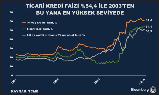 9 Şubat haftasında ticari kredilerde önemli bir sıçrama görüldü. Ticari kredilerde kredi hacmi ivmelenirken faizlerde de önemli bir sıçrama görüldü. Ticari kredi faizleri yüzde 54,4 ile 2003 yılından beri en yüksek seviyesine ulaştı.