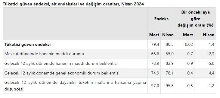 Türkiye İstatistik Kurumu ve Türkiye Cumhuriyet Merkez Bankası işbirliği ile yürütülen tüketici eğilim anketi sonuçlarından hesaplanan tüketici güven endeksi, Mart ayında 79,4 iken Nisan ayında %1,4 oranında artarak 80,5 oldu.