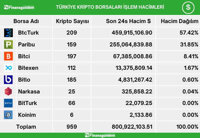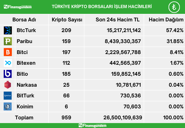 Türkiye’de, kripto alım satımına aracılık eden şirketlerin TL ve USD işlem hacimleri son 24 saat içinde şöyle;