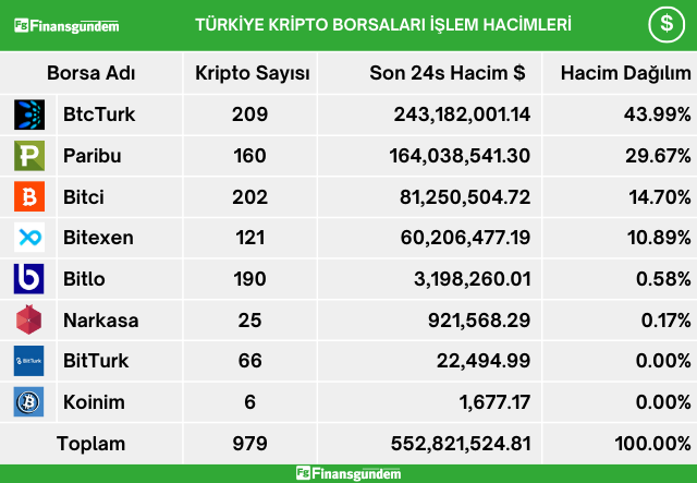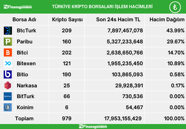 Türkiye’de, kripto alım satımına aracılık eden şirketlerde yatırımcılar, son 24 saatte 17.9 milyar TL ve 552.8 milyon USD işlem hacmi gerçekleştirdiler. Bu hacimlerin şirketlere göre dağılımı ise şöyle; ü ü Kaynak: 21milyon.com