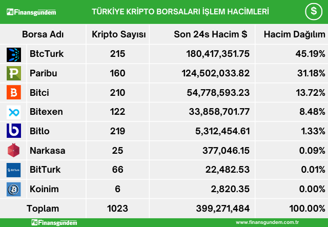 Türkiye’de yatırımcılar, kripto alım satımına aracılık eden şirketlerde, son 24 saatte 12.973 milyar TL (399.2 milyon USD) işlem hacmi gerçekleştirdiler. Gerçekleşen bu işlem hacminin şirketlere göre dağılımı TL ve USD olarak şöyle;