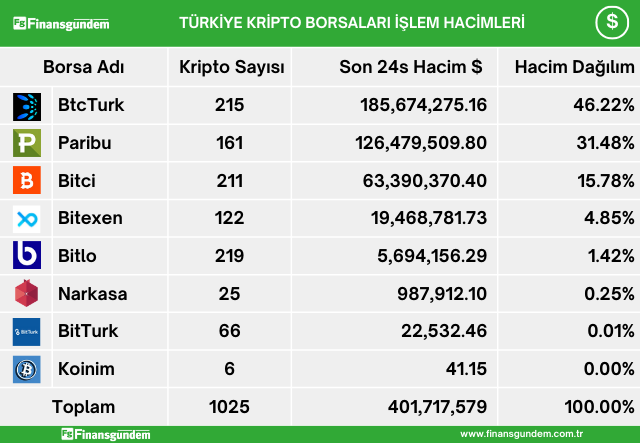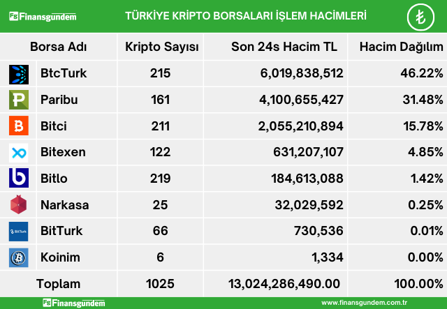 Türkiye’de yatırımcılar, kripto alım satımına aracılık eden şirketlerde, son 24 saatte 13 milyar TL (401.7 milyon USD) işlem hacmi gerçekleştirdiler. Gerçekleşen bu işlem hacminin şirketlere göre dağılımı TL ve USD olarak şöyle;