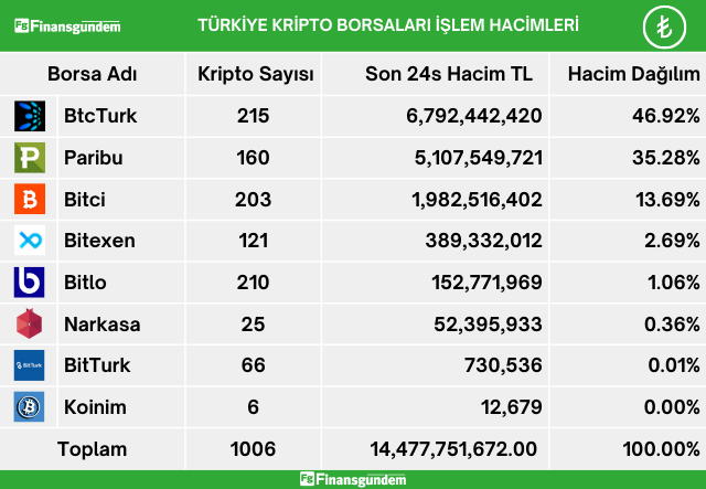 Türkiye’de yatırımcılar, kripto alım satımına aracılık eden şirketlerde, son 24 saatte 14.477 milyar TL (429.2 milyon USD) işlem hacmi gerçekleştirdiler. Gerçekleşen bu işlem hacminin şirketlere göre dağılımı TL ve USD olarak şöyle;