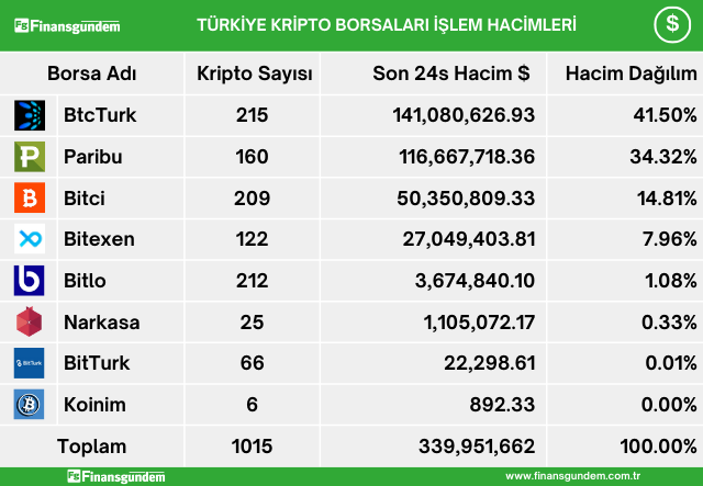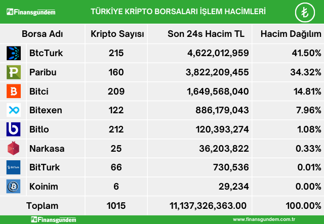 Türkiye’de yatırımcılar, kripto alım satımına aracılık eden şirketlerde, son 24 saatte 11.137 milyar TL (339.9 milyon USD) işlem hacmi gerçekleştirdiler. Gerçekleşen bu işlem hacminin şirketlere göre dağılımı TL ve USD olarak şöyle;