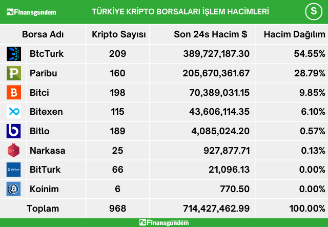Türkiye’de, kripto alım satımına aracılık eden şirketlerde yatırımcılar, son 24 saatte 23.1 milyar TL ve 714.4 milyon USD işlem hacmi gerçekleştirdiler. Bu hacimlerin şirketlere göre dağılımı ise şöyle;