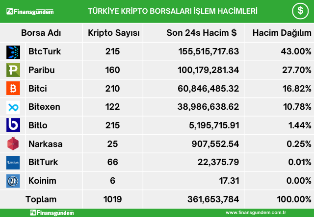 Türkiye’de yatırımcılar, kripto alım satımına aracılık eden şirketlerde, son 24 saatte 11.8 milyar TL (361.6 milyon USD) işlem hacmi gerçekleştirdiler. Gerçekleşen bu işlem hacminin şirketlere göre dağılımı TL ve USD olarak şöyle;