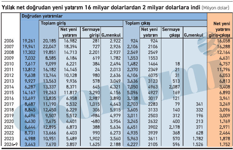 Gelen yatırım azalırken, giden yatırımın artması gibi bir eğilim yaşanıyor ve sonuçta yıllık bazda 15-16 milyar dolarlardan 2 milyarüdolarücivarına inildiği gözleniyor.