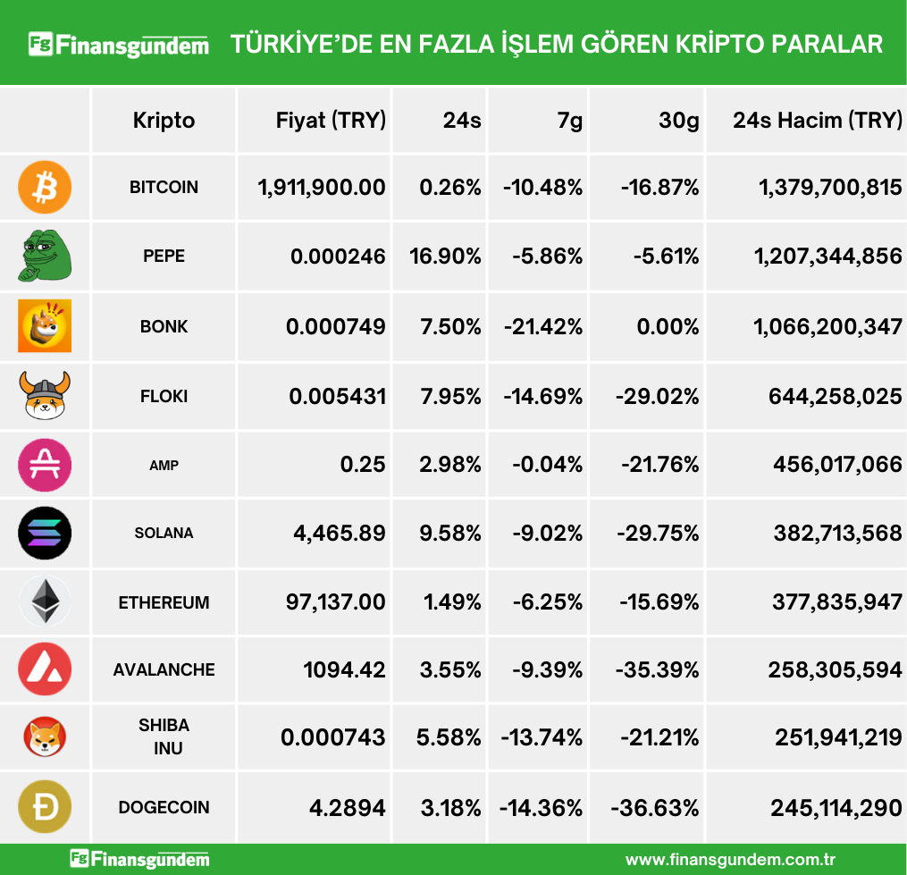 Türkiye’de işlem gören kripto paraların, son 24 saatteki fiyat ve hacimleri (Türk Lirası ve Amerikan Doları cinsinden) ü ü Kaynak: 21milyon.com