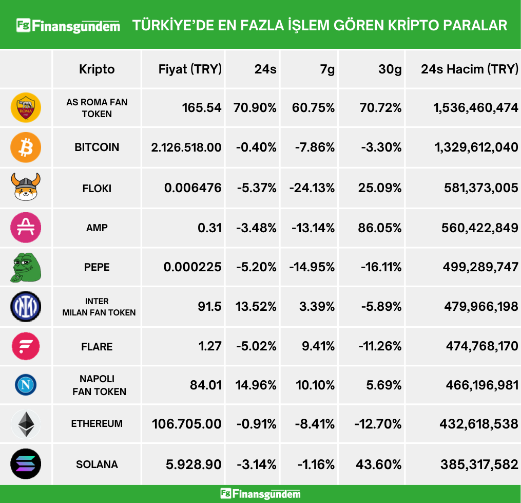 Türkiye’de işlem gören kripto paraların, son 24 saatteki fiyat ve hacimleri (Türk Lirası ve Amerikan Doları cinsinden) ü