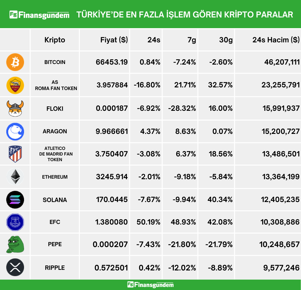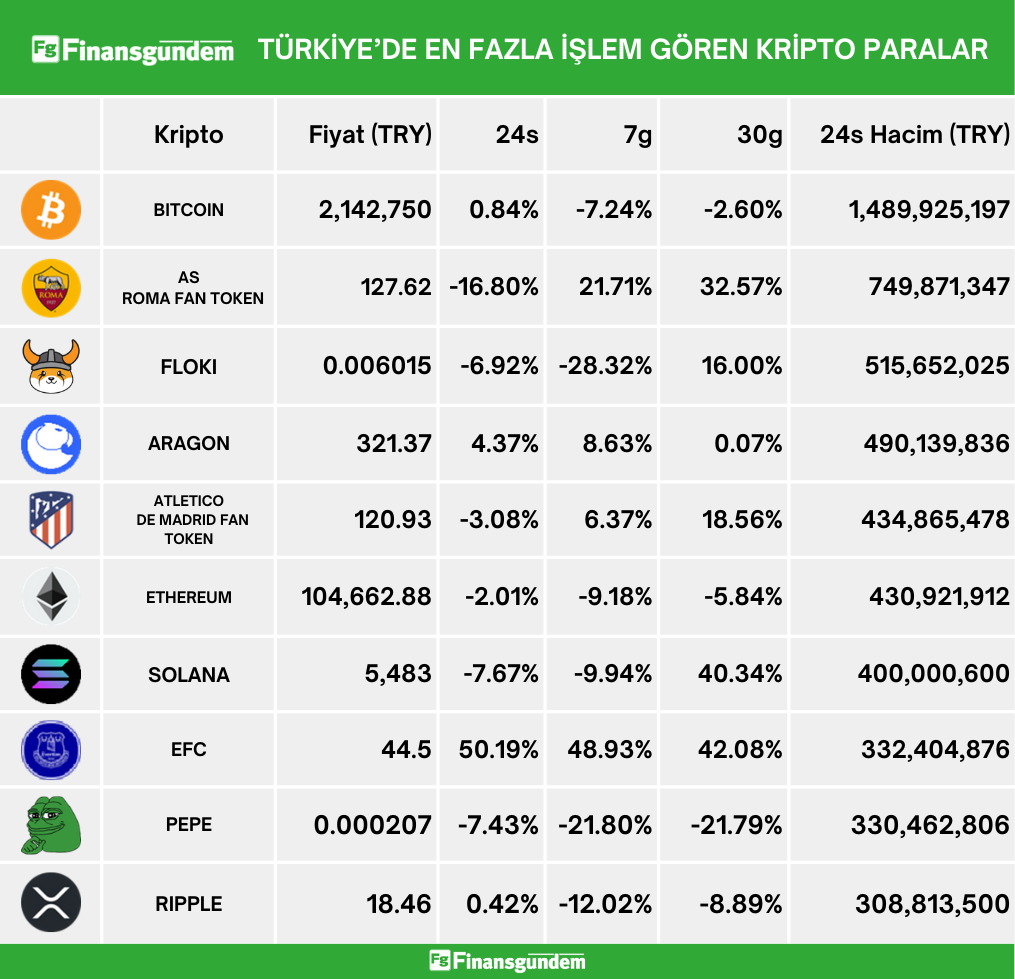 Türkiye’de işlem gören kripto paraların, son 24 saatteki fiyat ve hacimleri (Türk Lirası ve Amerikan Doları cinsinden)