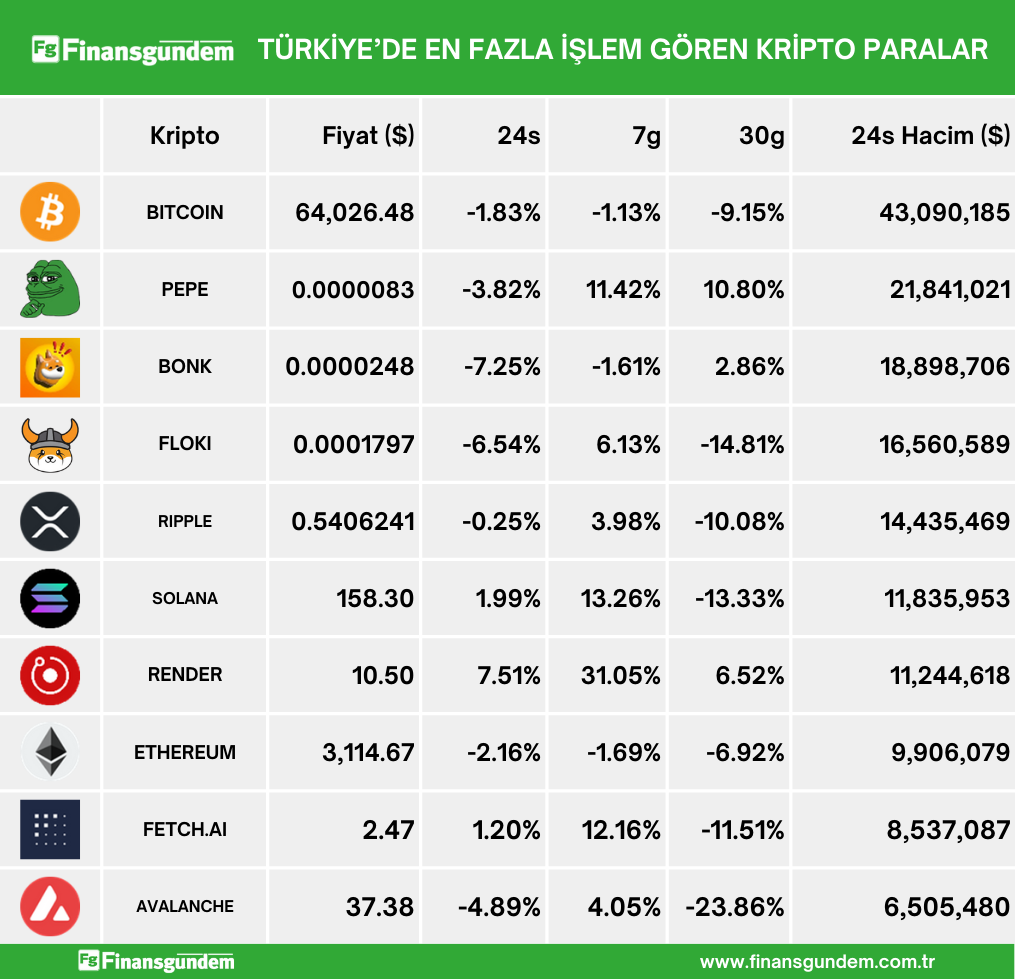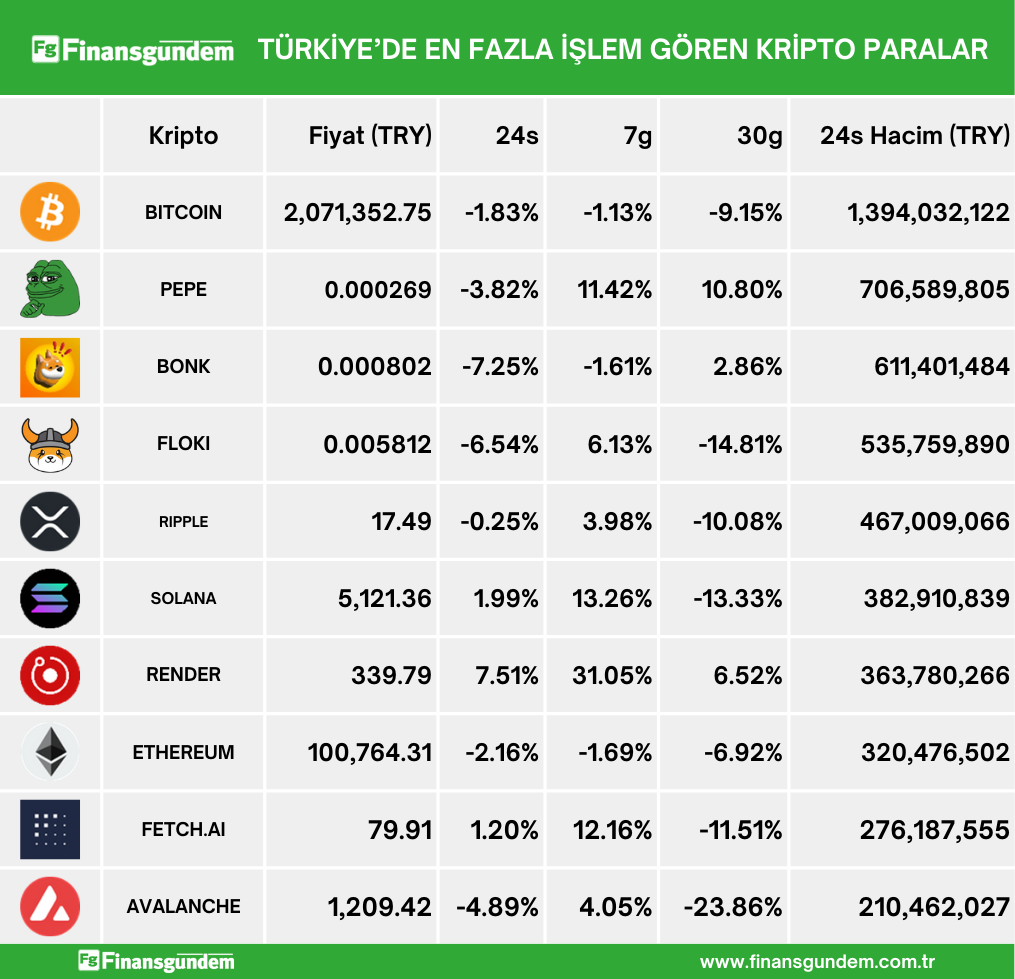 Türkiye’de işlem gören kripto paraların, son 24 saatteki fiyat ve hacimleri (Türk Lirası ve Amerikan Doları cinsinden) ü Kaynak: 21milyon.com