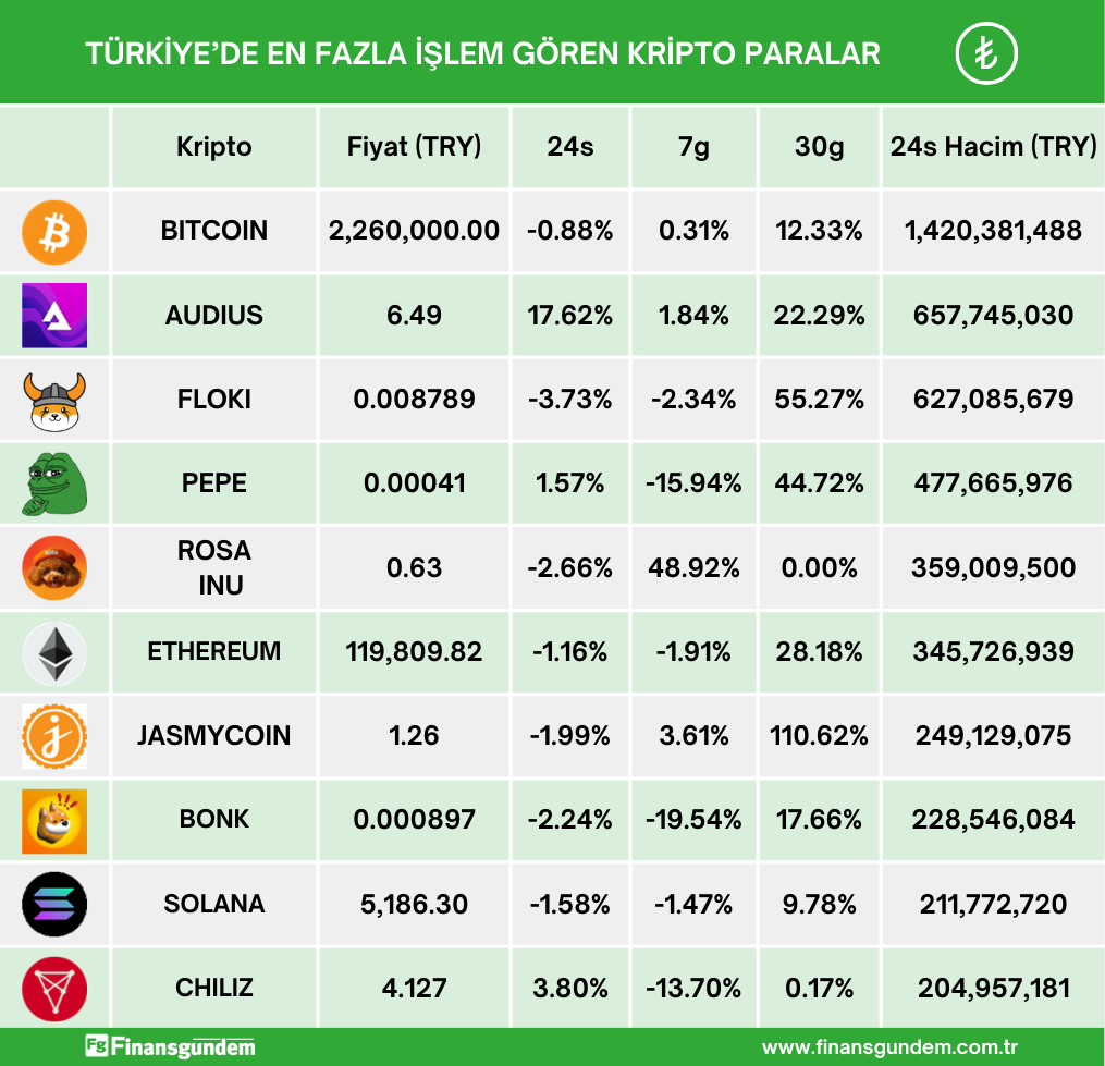 Türkiye’de işlem gören kripto paraların, son 24 saatteki fiyat (TL ve $) ve hacimleri ü ü Kaynak: 21milyon.com