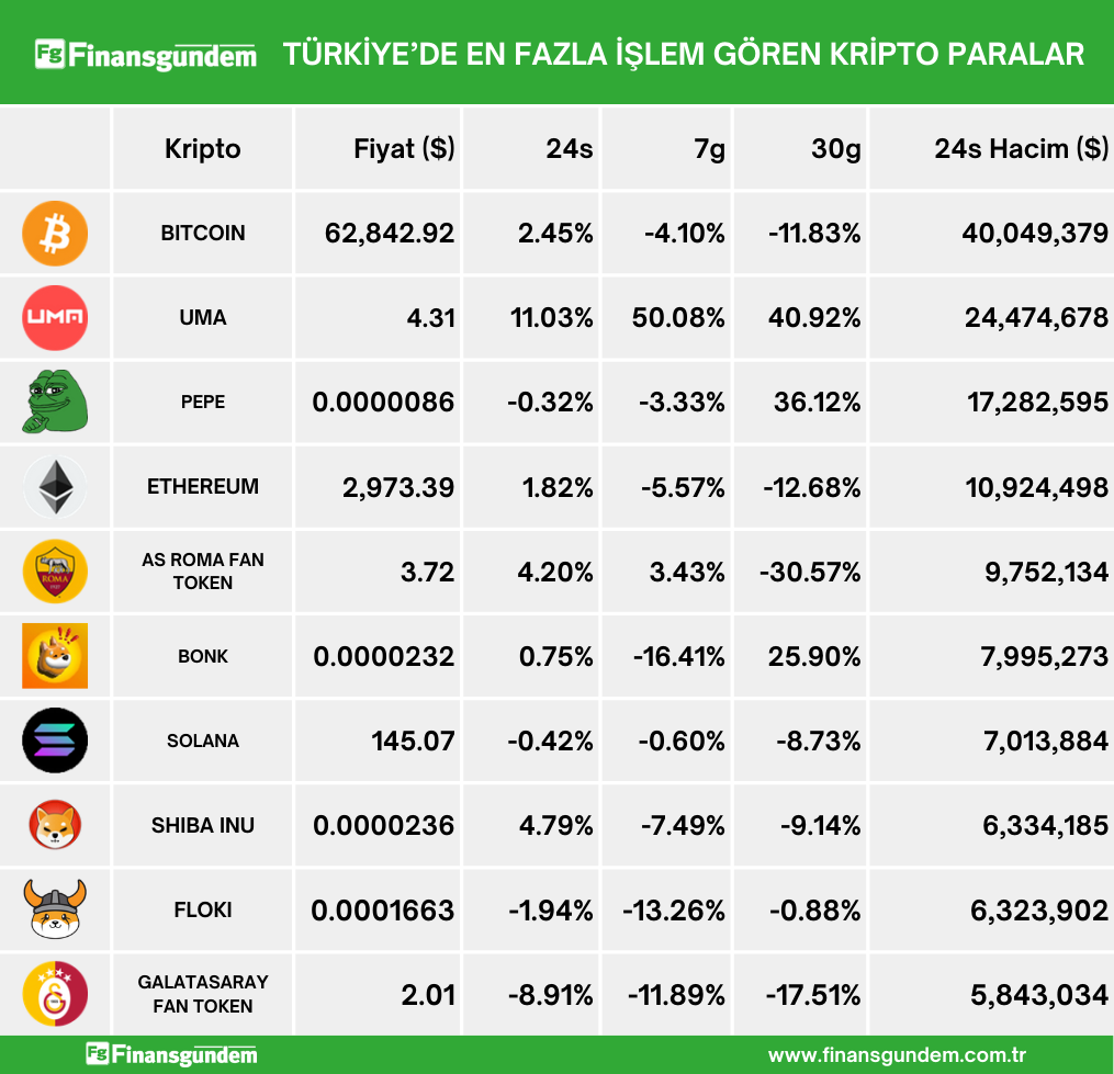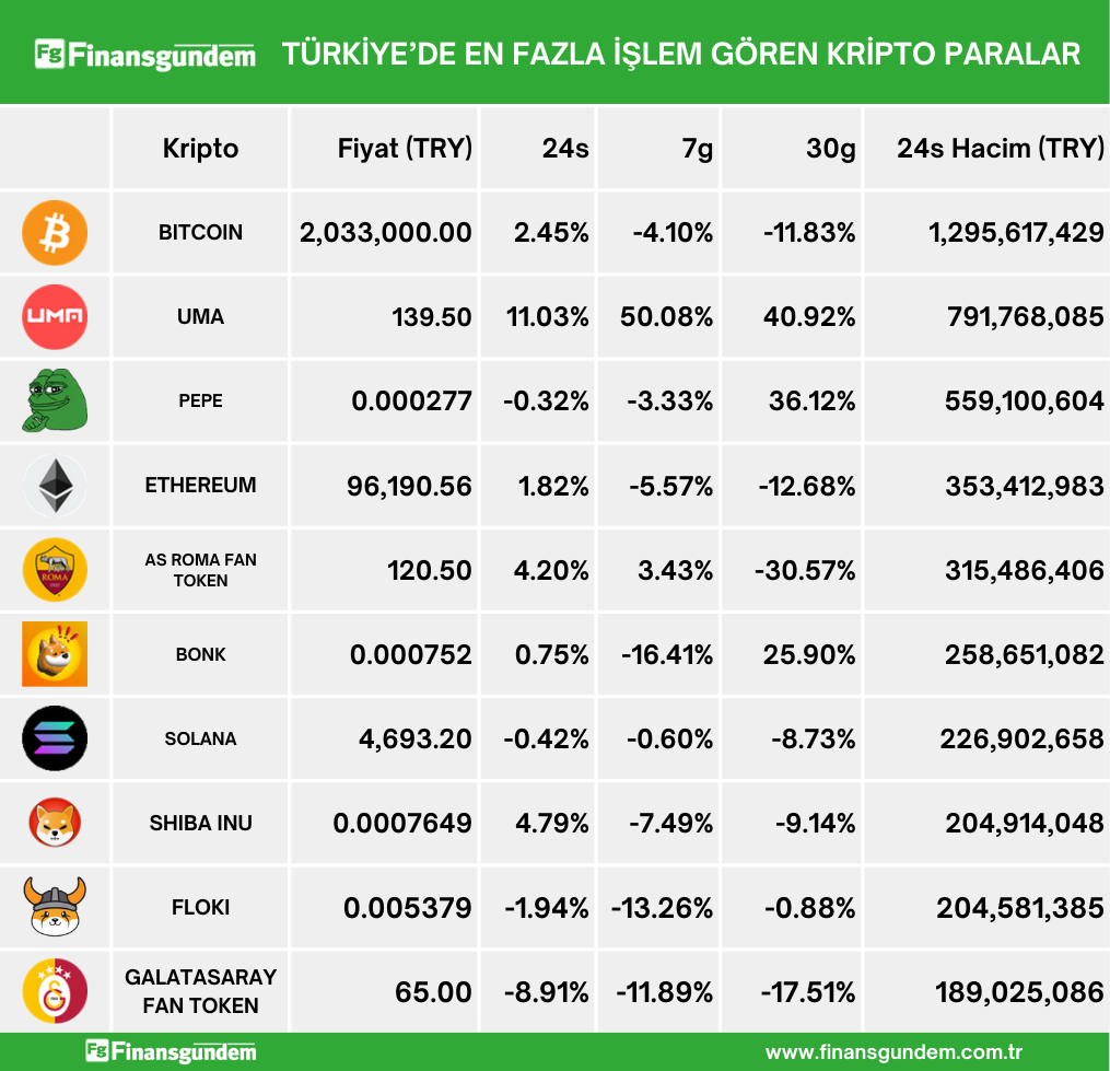 Türkiye’de işlem gören kripto paraların, son 24 saatteki fiyat (TL ve $) ve hacimleri