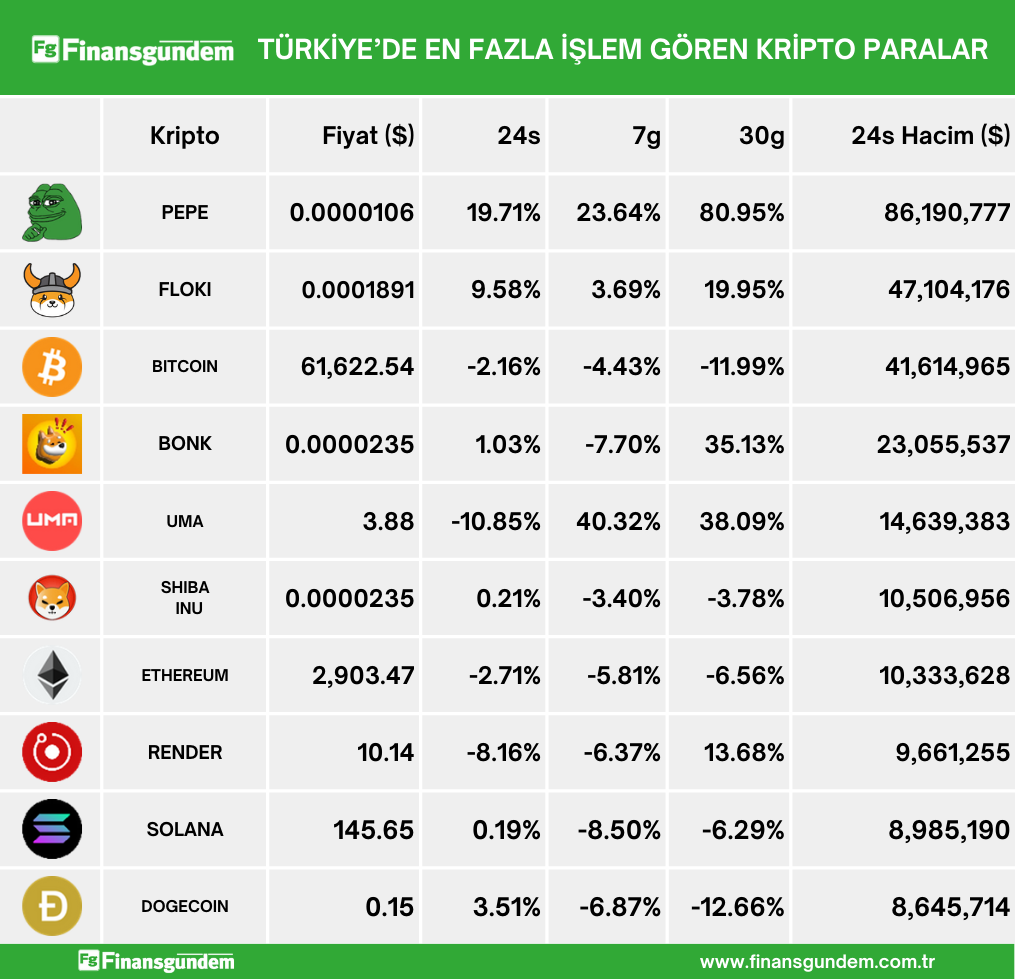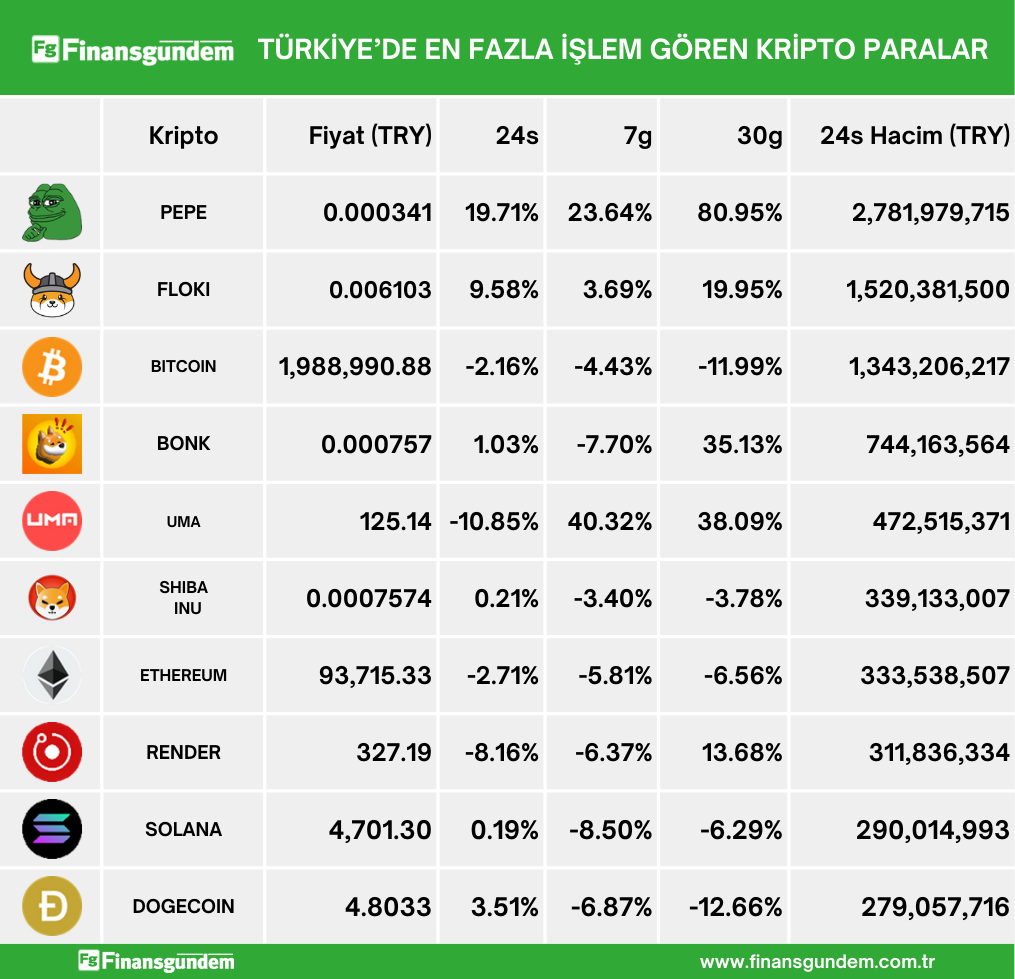 Türkiye’de işlem gören kripto paraların, son 24 saatteki fiyat (TL ve $) ve hacimleri ü ü Kaynak: 21milyon.com
