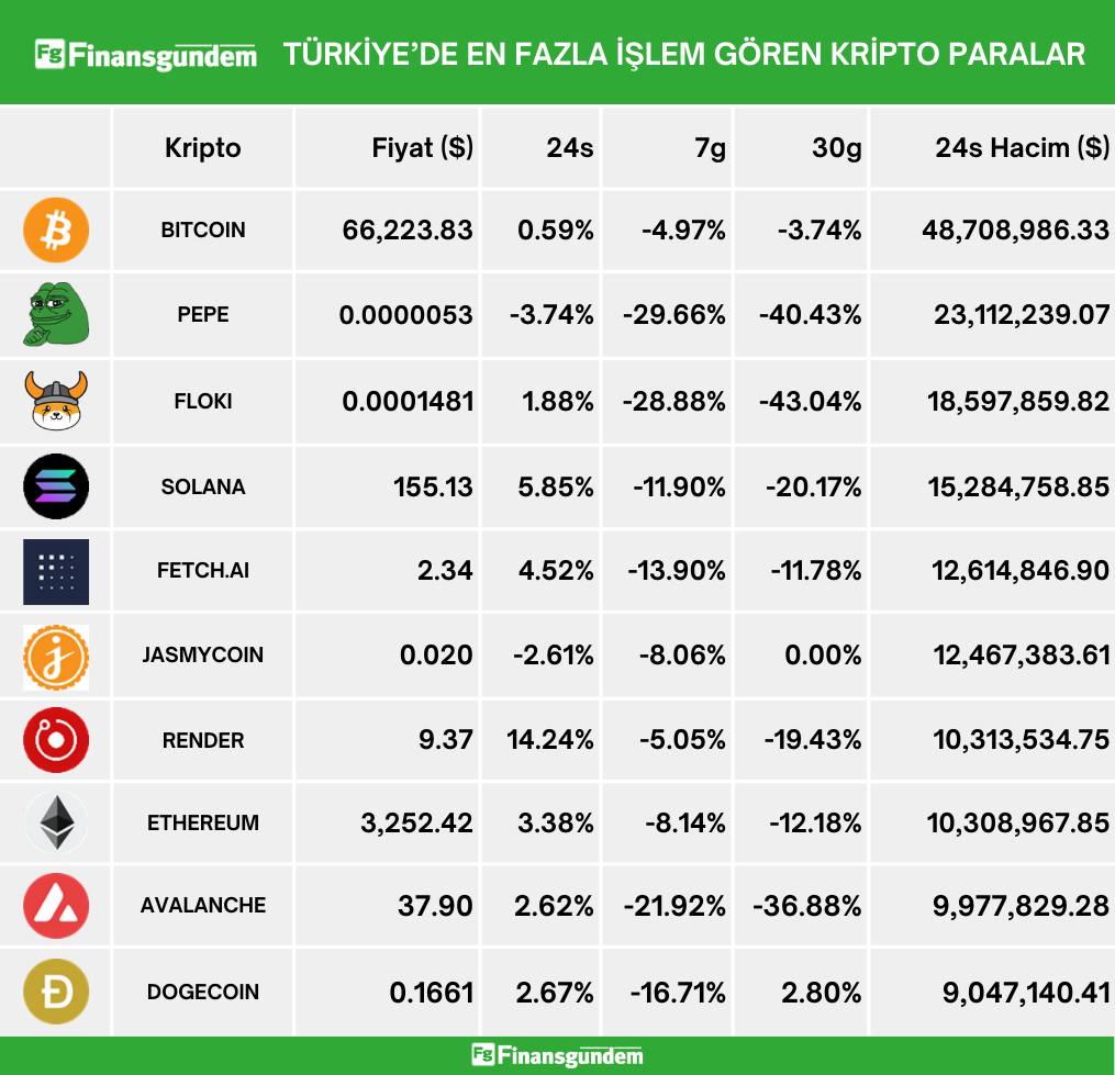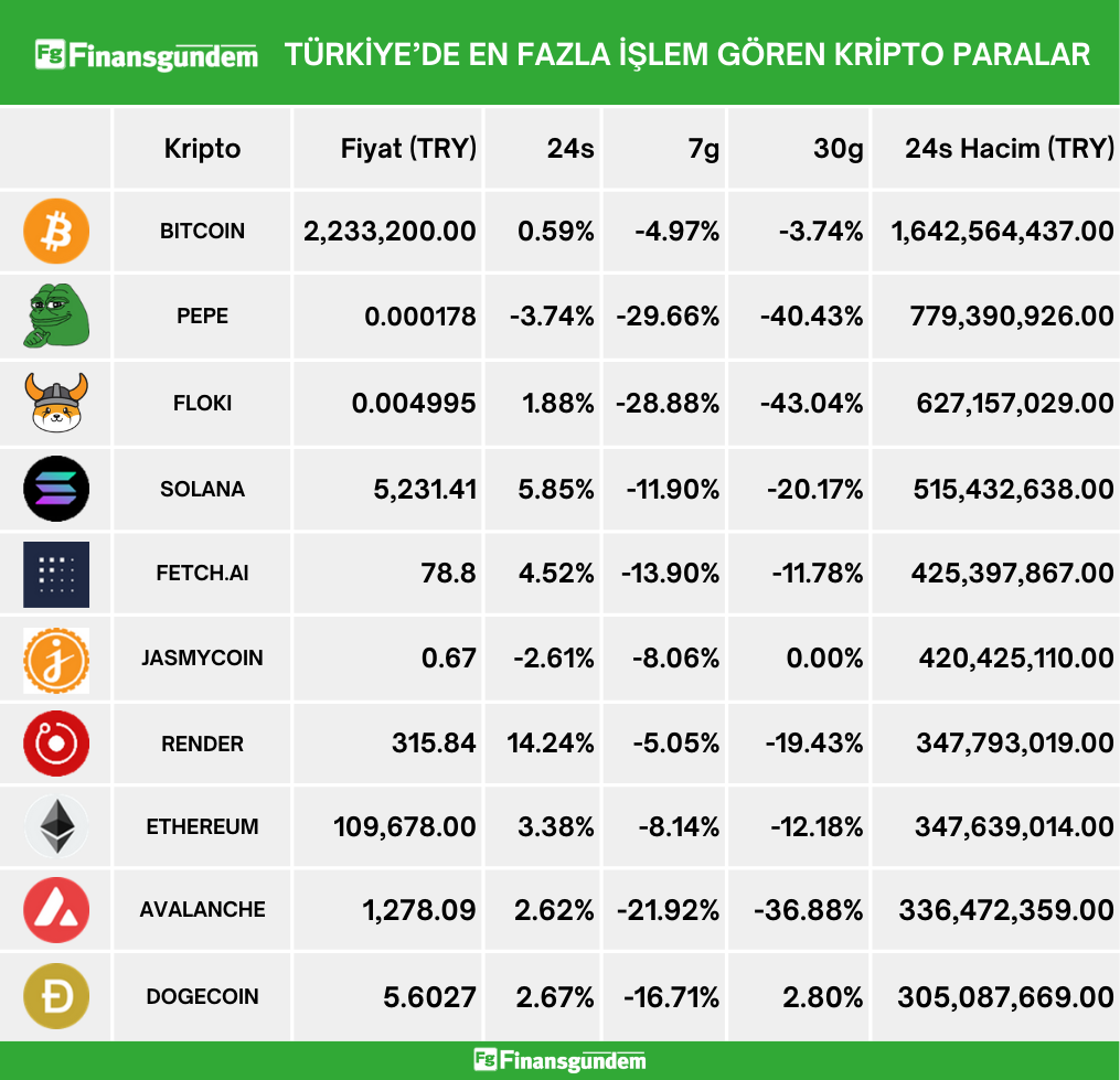 Türkiye’de işlem gören kripto paraların, son 24 saatteki fiyat ve hacimleri (Türk Lirası ve Amerikan Doları cinsinden) ü Kaynak: 21milyon.com