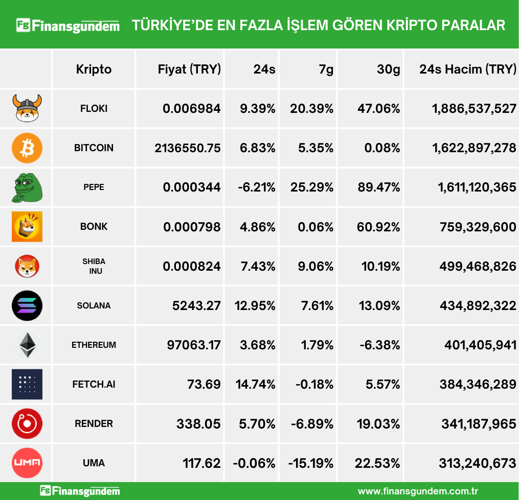 Türkiye’de işlem gören kripto paraların, son 24 saatteki fiyat (TL ve $) ve hacimleri ü ü Kaynak: 21milyon.com