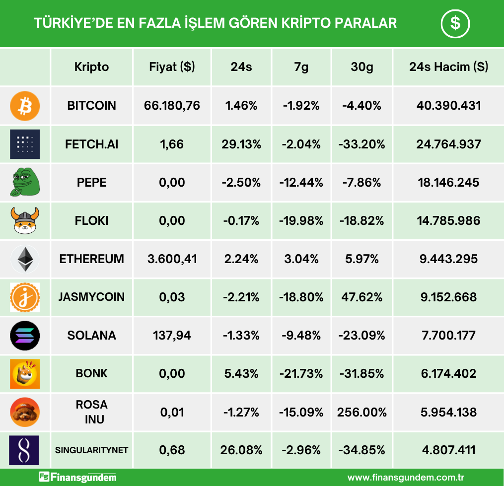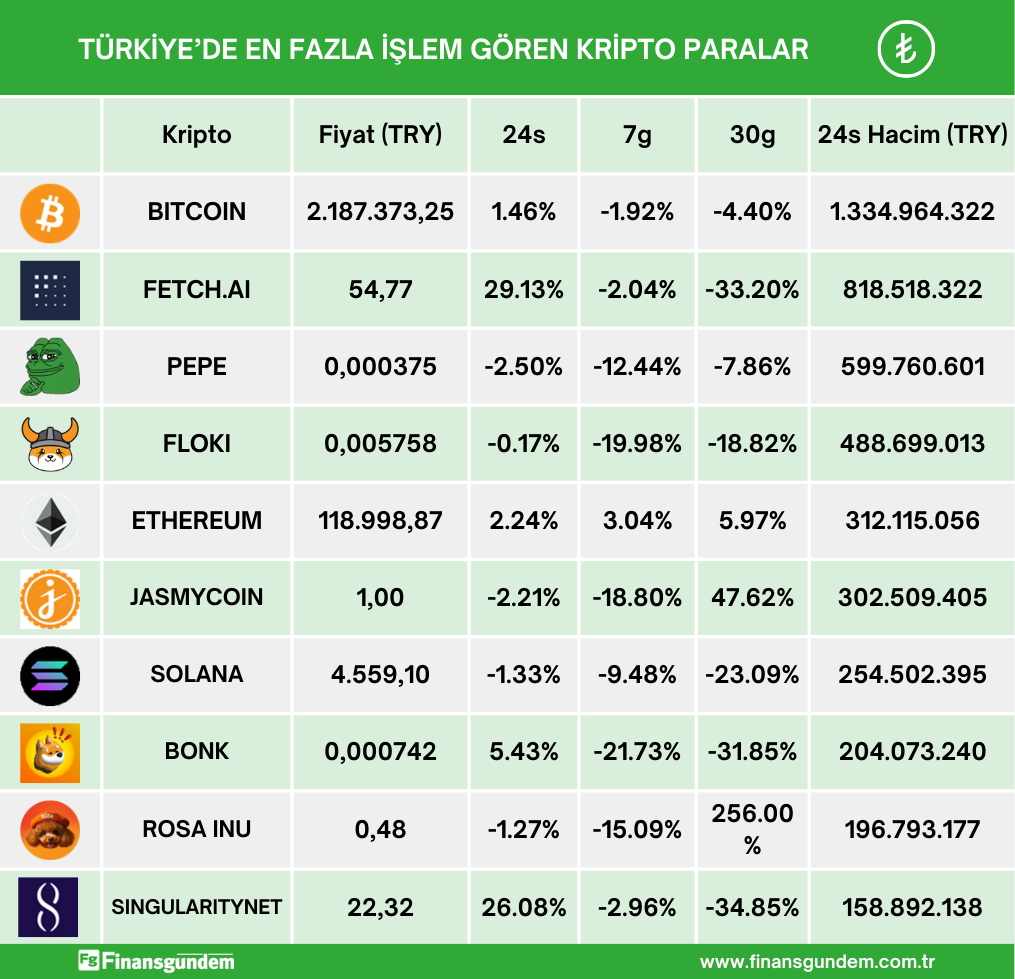 Türkiye’de işlem gören kripto paraların, son 24 saatteki fiyat (TL ve $) ve hacimleri ü ü Kaynak: 21milyon.com