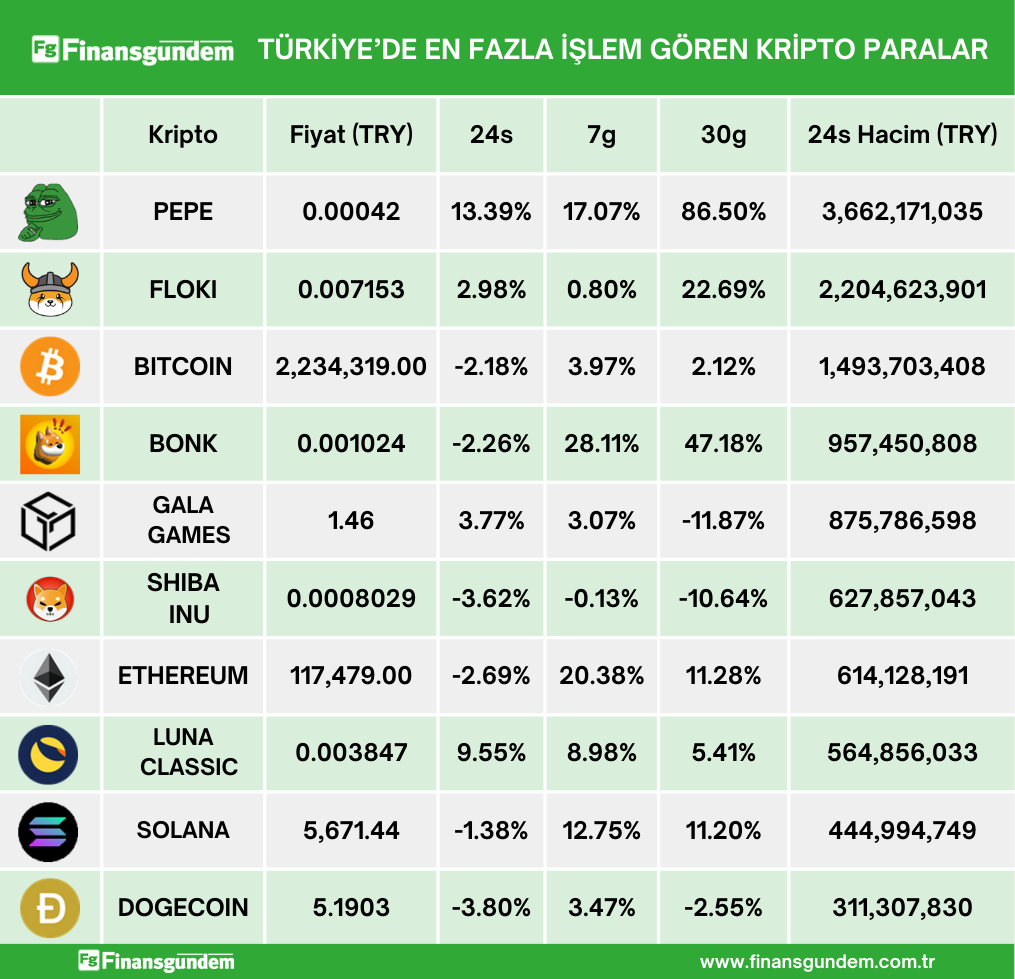 Türkiye’de işlem gören kripto paraların, son 24 saatteki fiyat (TL ve $) ve hacimleri