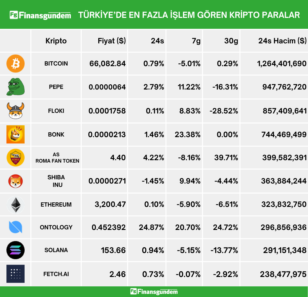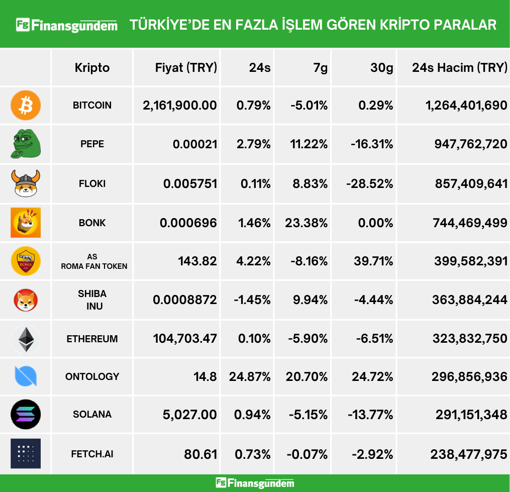Türkiye’de işlem gören kripto paraların, son 24 saatteki fiyat ve hacimleri (Türk Lirası ve Amerikan Doları cinsinden)