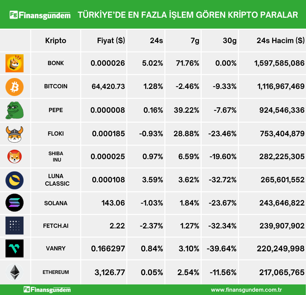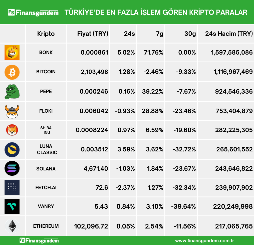 Türkiye’de işlem gören kripto paraların, son 24 saatteki fiyat ve hacimleri (Türk Lirası ve Amerikan Doları cinsinden) ü ü Kaynak: 21milyon.com