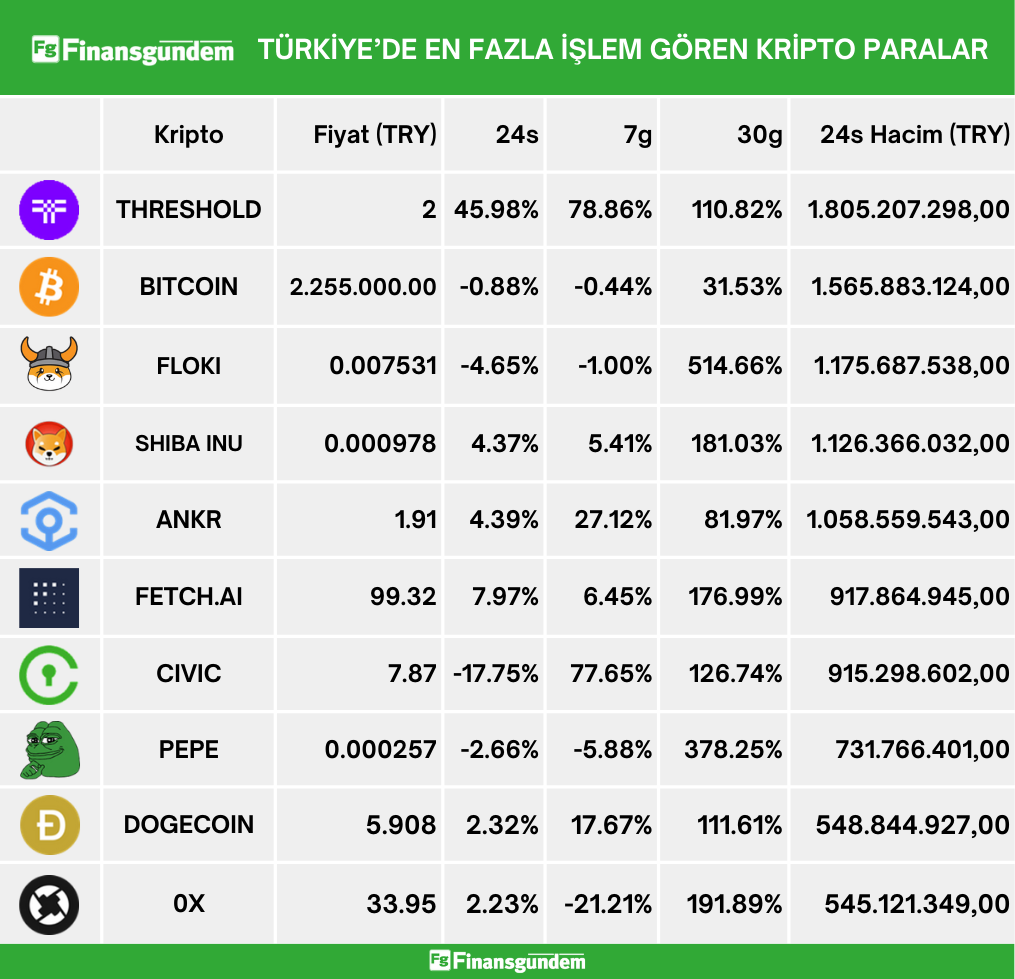Türkiye’de faaliyet gösteren dijital para alım satım borsalarında, en çok işlem gören kripto paralar ü ü Kaynak: 21milyon.com ü ü
