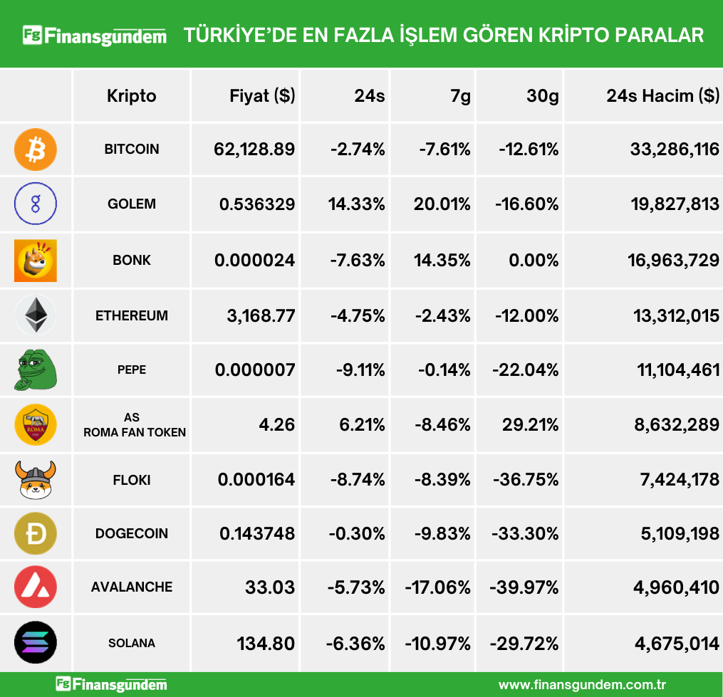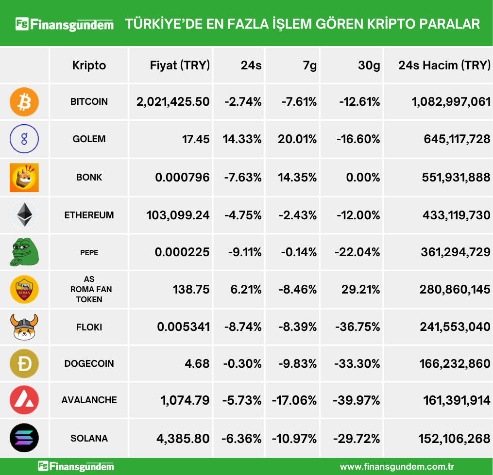 Türkiye’de işlem gören kripto paraların, son 24 saatteki fiyat ve hacimleri (Türk Lirası ve Amerikan Doları cinsinden) ü ü Kaynak: 21milyon.com