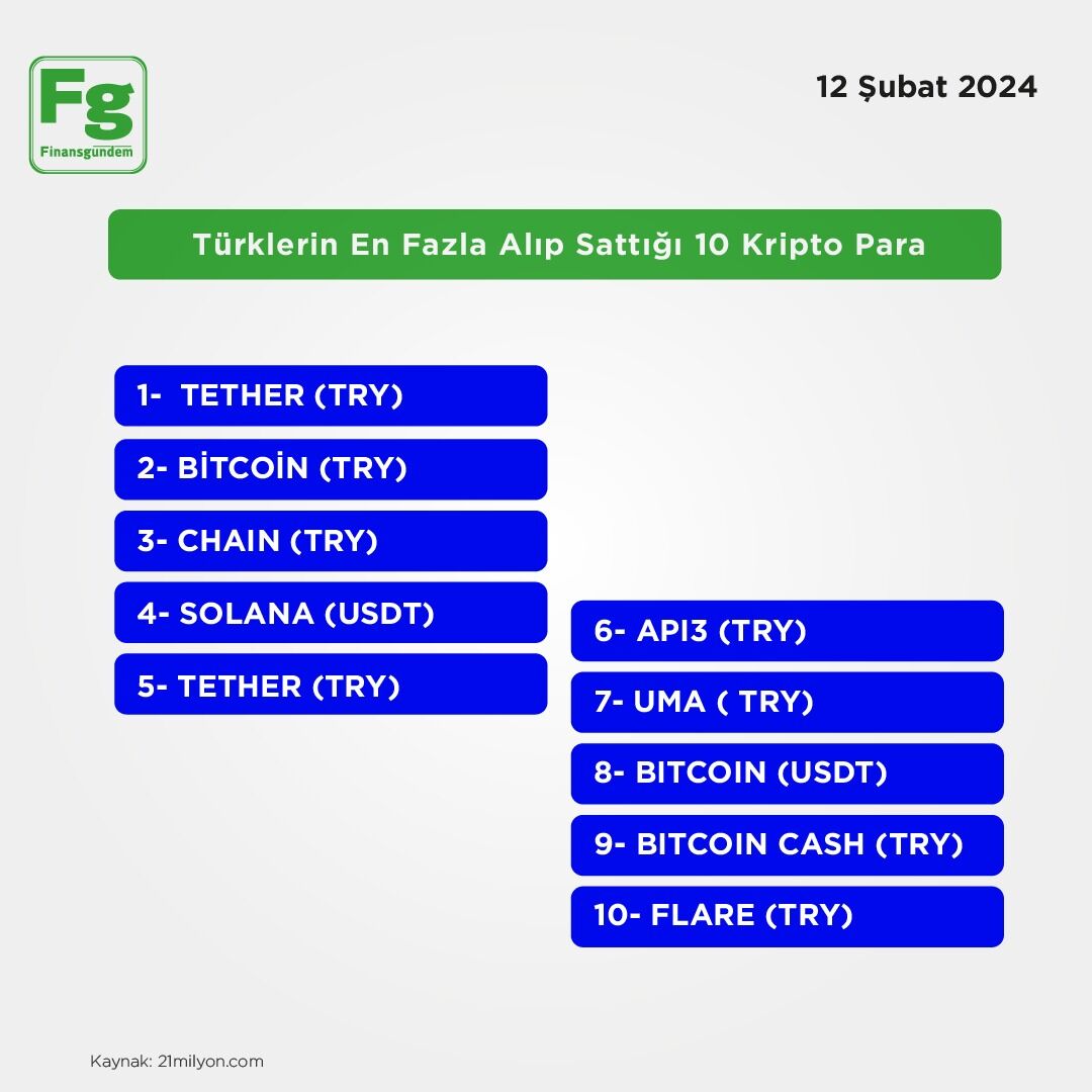 Listenin ilk sırasında TETHER işlem görüyor. TETHER’i BITCOIN’in takip ettiği listenin üçüncü sırasında ise CHAIN var. Listenin ilk 3 sırasında yer alan bu kripto paraların toplam işlem hacmi 1.3 milyar TL.ü